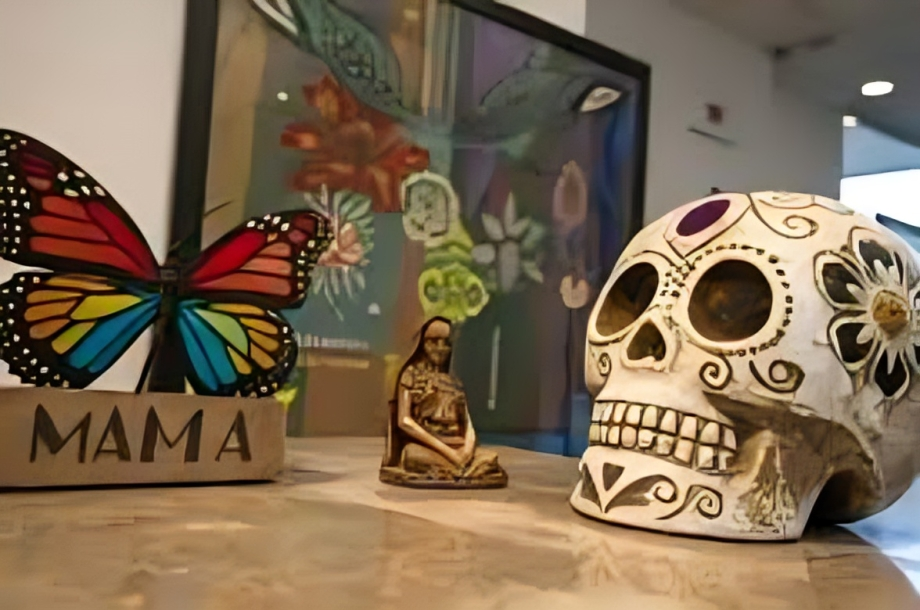 It combines symbols of transformation (butterfly), strength (skull), and identity (mama).